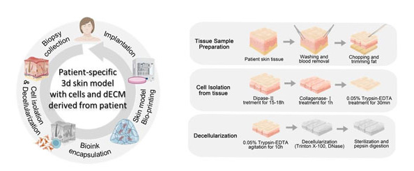 이에 연구팀은 몸이 기억하는 재료로 새살을 만드는 법에 주목했다. 환자 피부에서 세포를 제거한 탈세포화 세포외기질을 만들고 각질형성세포, 섬유아세포와 함께 3D 바이오프린팅 기술로 재조합했다. 환자의 단백질 조성과 미세구조를 보존하고 있는 자기 조직을 피부 재생에 사용하도록 한 것이다.