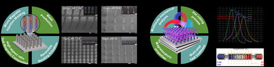 - 세계 최초로 사출성형 공정을 자기 엑츄에이터 제조에 적용, 외부 자기장에 따라 동작이 조절 가능한 프로그래머블 마이크로 어레이 및 자극 반응형 자기 복합소재를 개발 (패턴 폭 50μm, 높이 500μm, 종횡비 10의 세계 최고 수준 달성)